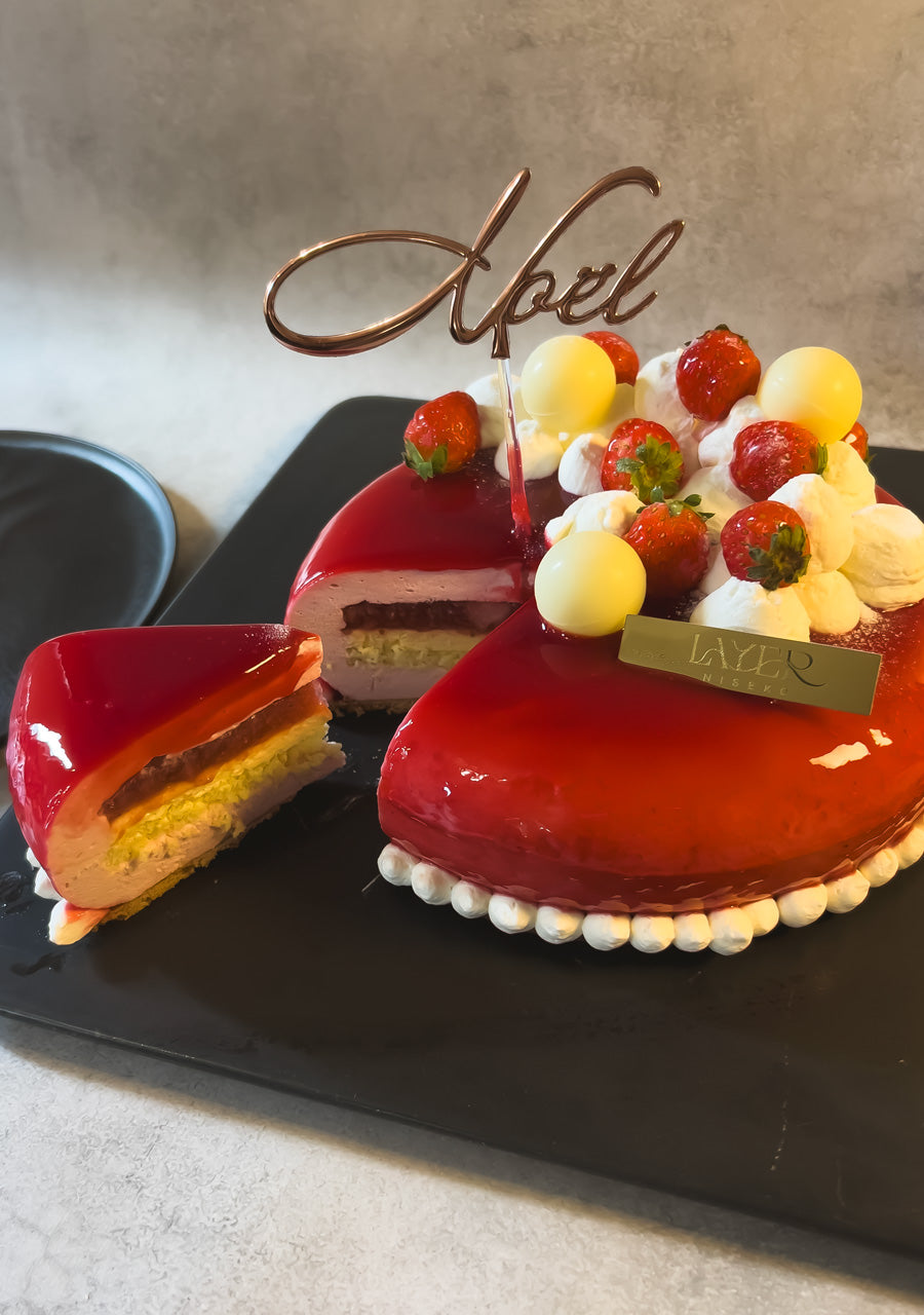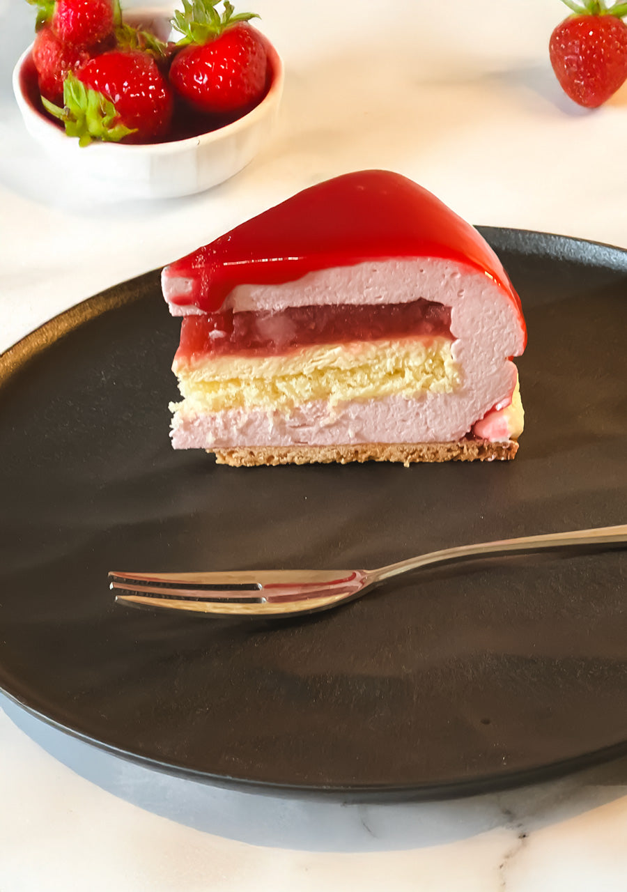 Layers of strawberry mousse, crème brûlée, jelly, and soft sponge on a crisp biscuit base. A delicate harmony of flavour